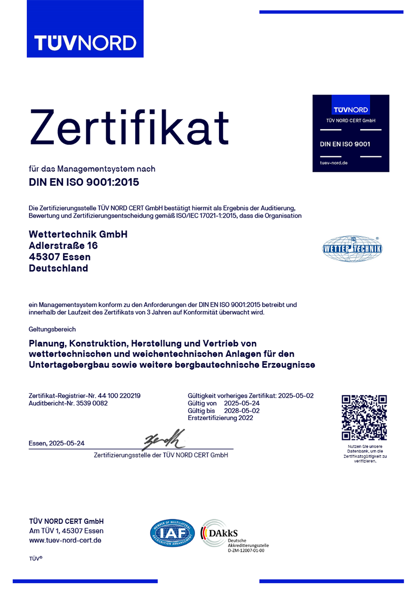 Um eine lückenlose Qualitätssicherung zu gewährleisten, ist selbstverständlich neben der Wettertechnik GmbH auch unser Fertigungsbetrieb zertifiziert.